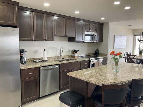 High ceilings, premium finishes, oven, and cooktop.