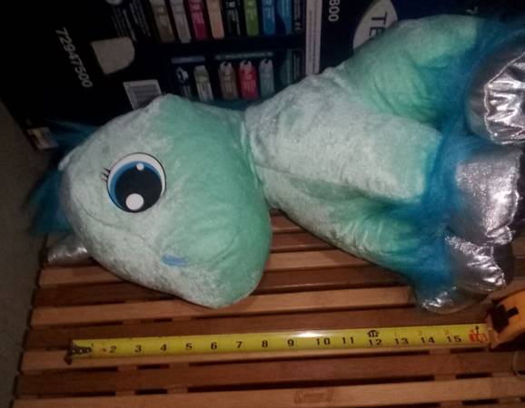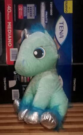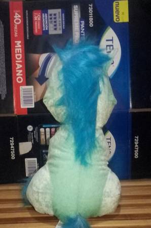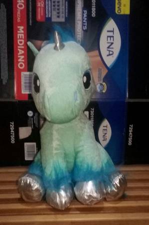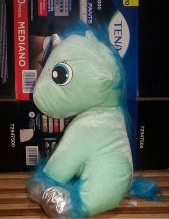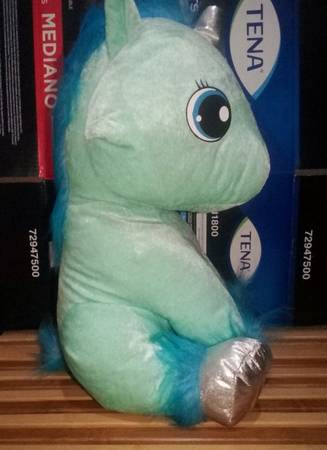 Unicornio azul de peluche mide 16 pulgadas de largo y lo puedes tener sentado en donde quieras lo dejo en $400 pesitos manden email o texto entrego en costco rio